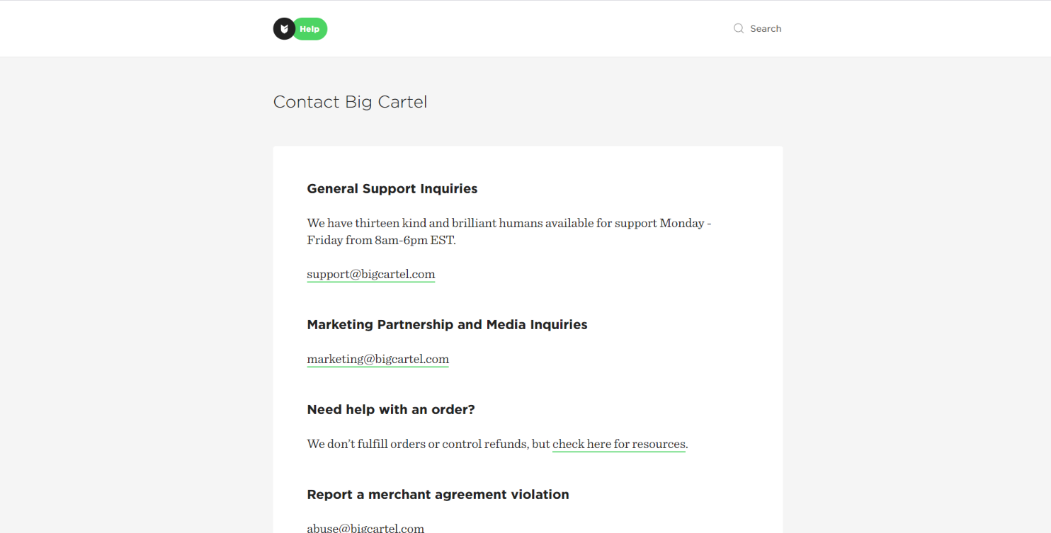 或者您可以通过[email protected]直接向他们发送电子邮件。 但是,最大的缺点是 Big Cartel 的客户支持不是 24/7 提供的。 帮助频道仅通过电子邮件提供,在美国东部标准时间周一至周五上午 9 点至下午 6 点之间可用。