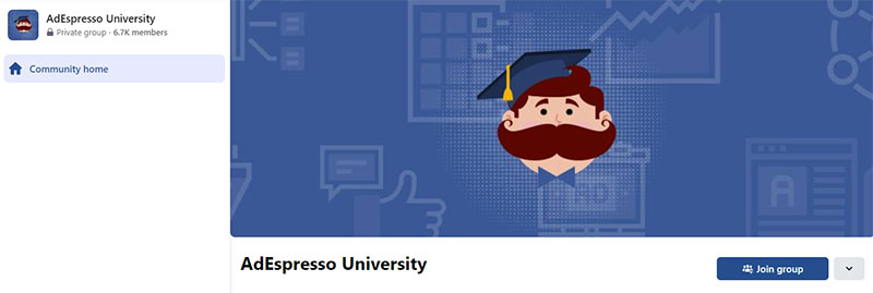 AdEspresso 大学的封面照片自称是最大的致力于 Facebook 和 Google 广告的 Facebook 团体,值得一看。 他们将公司吉祥物融入设计中,这是创造令人难忘和可识别的品牌形象的好策略。