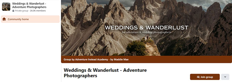 用精美的照片给潜在成员留下深刻印象,并让现有成员为成为您社区的一员而感到自豪。 Weddings & Wanderlust – Adventure Photographers 的 Facebook 群组封面照片是一对新娘和新郎站在陡峭的悬崖上,背景是大山。 它精彩地展示了一个美丽而冒险的目的地婚礼地点。