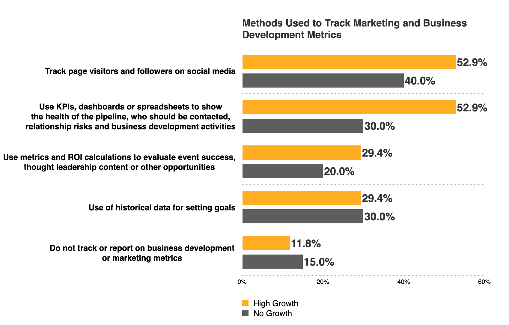 高增长的律师事务所不仅使用了更多的技术,而且还产生了更大的影响。 跟踪指标对于他们如何运行营销和业务开发功能是不可或缺的。 他们利用客户关系管理 (CRM) 平台等技术做出更好的营销和业务发展决策。 他们跟踪管道健康状况的可能性要高出 76%。 在评估工作的有效性时,他们使用 ROI 计算的可能性要高出 47%。