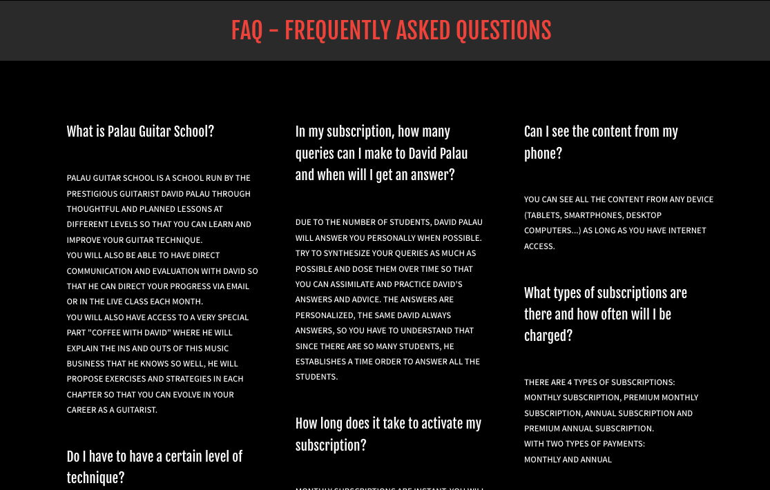 在设计方面,尝试创建一个多列布局,并在每一列中添加一个标题来描述课程类型,例如“初学者”或“Fingerstyle”。 从那里,添加要点中的课程内容和预计完成时间。 不要忘记添加课程的价格,无论是按小时收费还是基于课程。 对于学费页面,您还应该考虑添加可操作的按钮,例如电子邮件提示或联系页面的链接。