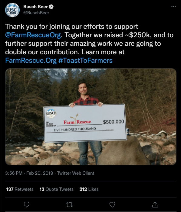 Busch Beer 通过向 Farm Rescue 捐款来支持美国农民。 Farm Rescue 是一家非营利组织,在农户需要时提供种植和收割庄稼、收集干草和饲养牲畜的援助。 Busch Beer 承诺为该组织的每条转推提供 5 美元。 他们最终获得了大约 35,400 条转推。