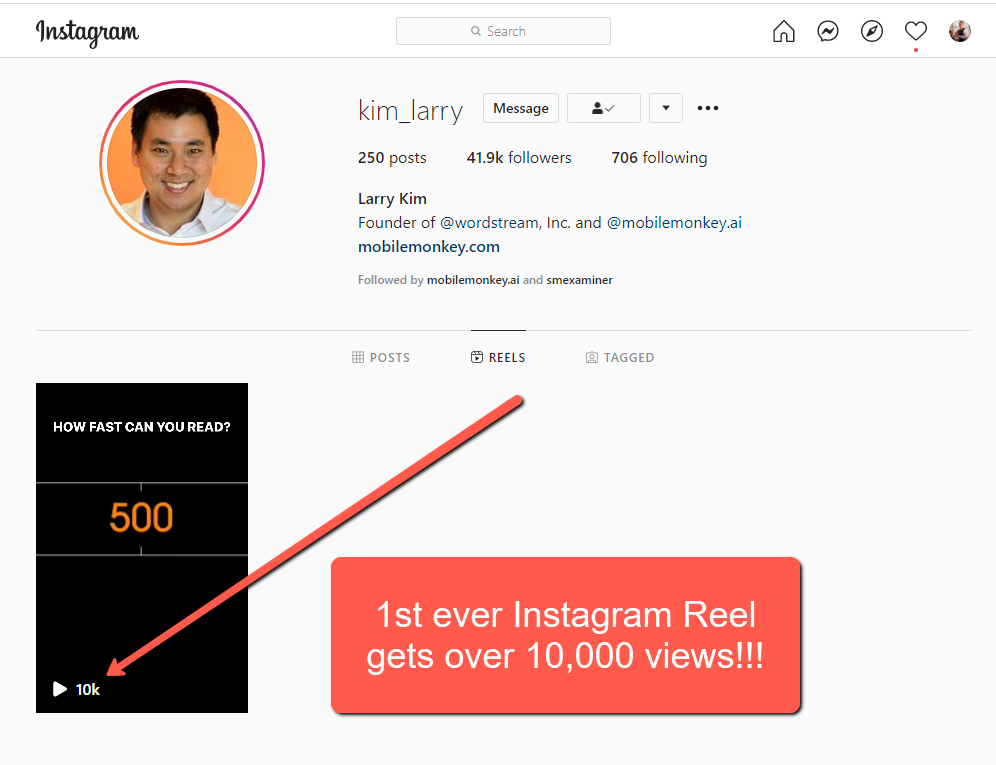 看看我们的 CEO Larry Kim 是如何在他的第一个 Instagram Reel 上获得超过 10,000 次观看的!