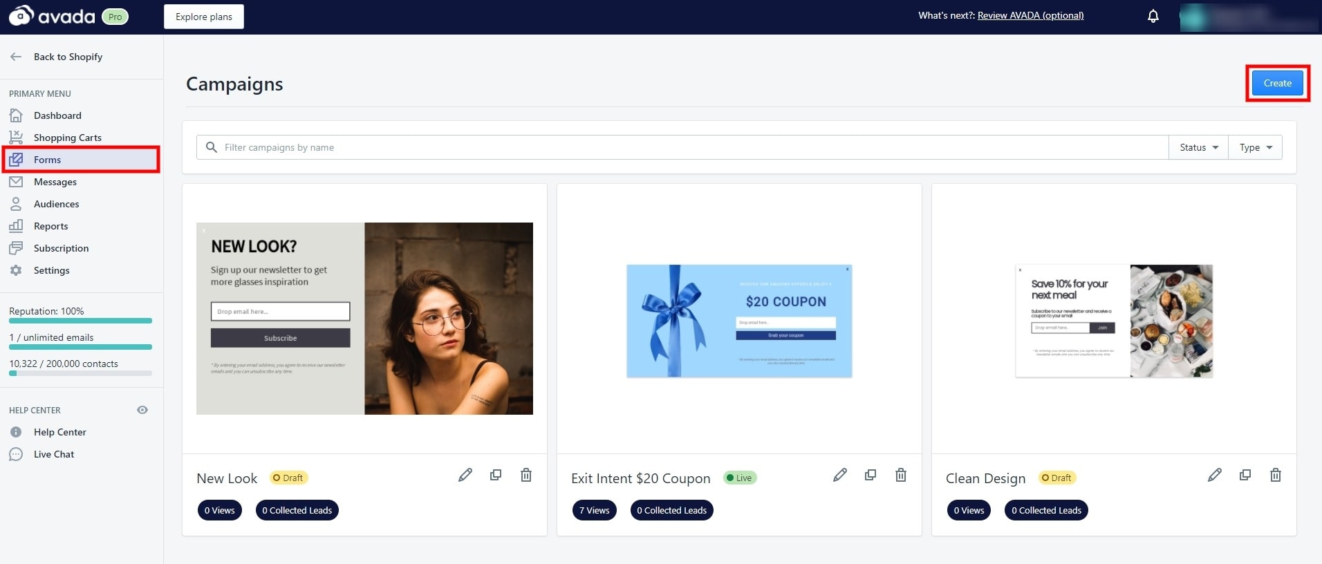 弹出表单编辑器是您自定义时事通讯弹出窗口、复制现有活动或删除未使用的弹出窗口的地方。 要访问弹出表单并创建一个新表单,请从仪表板中选择“表单”->“创建”,如上图所示。