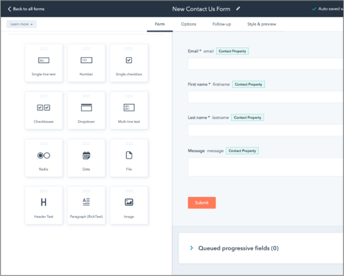 虽然它不是更复杂的表单生成器工具之一,但您在使用 HubSpot 的表单生成器时不需要任何技术专业知识。 使用拖放式表单生成器可以轻松构建表单。 您还可以通过使用连接到您的联系人数据库的无限表单字段、提交和自定义表单来转换未注册为潜在客户的在线访问者。