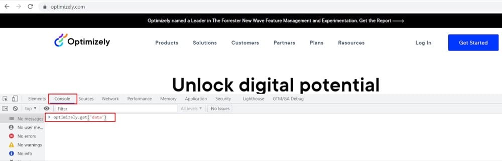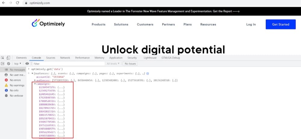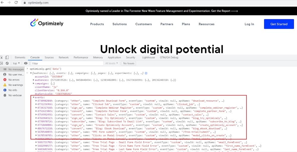 访问 Optimizely 网站(或任何其他具有 Optimizely 跟踪代码的页面)并在控制台选项卡下的 Chrome 开发人员工具中键入optimizely.get('data') ,以获取包含您所参与的活动实验和活动的对象.