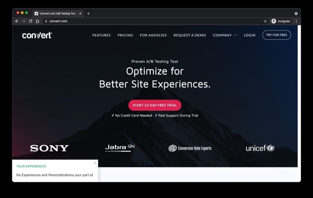 Convert Experiences 是一款实验和网络个性化软件,提供 A/B 测试、拆分测试、多变量测试、多页和个性化实验工具。 Convert 还提供高级细分工具,可让您根据用户的历史行为、cookie 和 JavaScript 事件对用户进行细分。