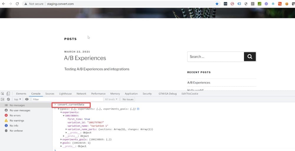 访问 Convert 网站(或任何其他具有 Convert 跟踪代码的页面)并在控制台选项卡下的 Chrome 开发人员工具中键入convert.currentData ,以获取一个包含您所参与的活动实验的对象。