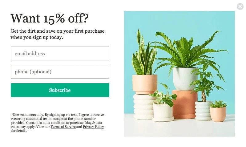 The Sill 选择使用最小但令人印象深刻的弹出表单来吸引目标受众。 标题“想要 15% 的折扣?” 是一个很好的号召性用语,因为大多数人都喜欢在购物时获得折扣。