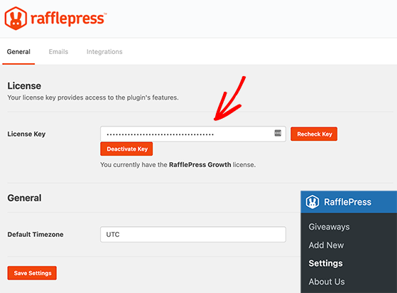 激活插件后,从您的 WordPress 管理员导航到RafflePress » 设置,然后粘贴您的许可证密钥。