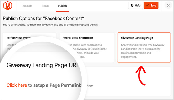 要设置赠品登陆页面,请单击赠品编辑器中的“发布”选项卡,然后选择“赠品登陆页面”选项。