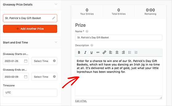 首先,您需要让参赛者知道他们可以赢得什么,因此请点击“我的大奖”标题并将其替换为您的圣帕特里克节赠品奖品。