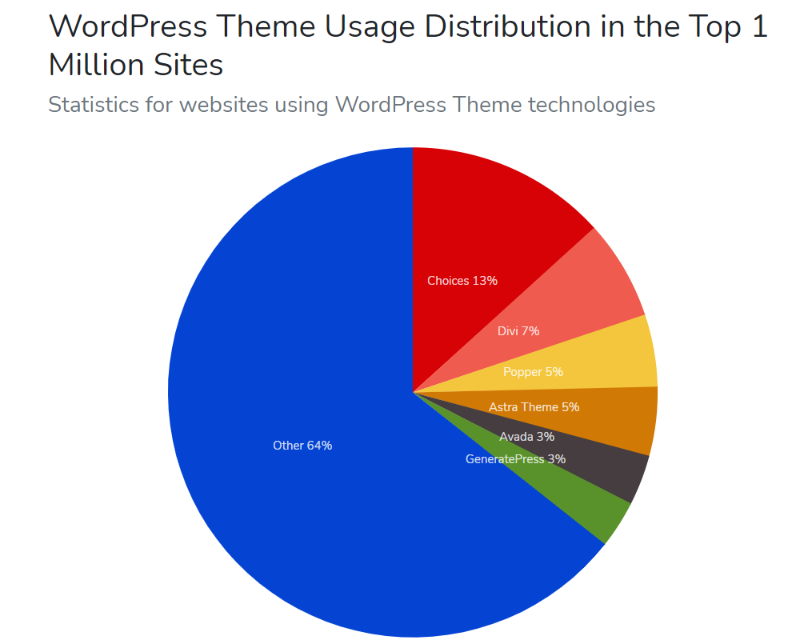 根据 Builtwith 的数据,使用最多的 WordPress 主题是Choices ,拥有34,443 个网站,占 3.4%。
