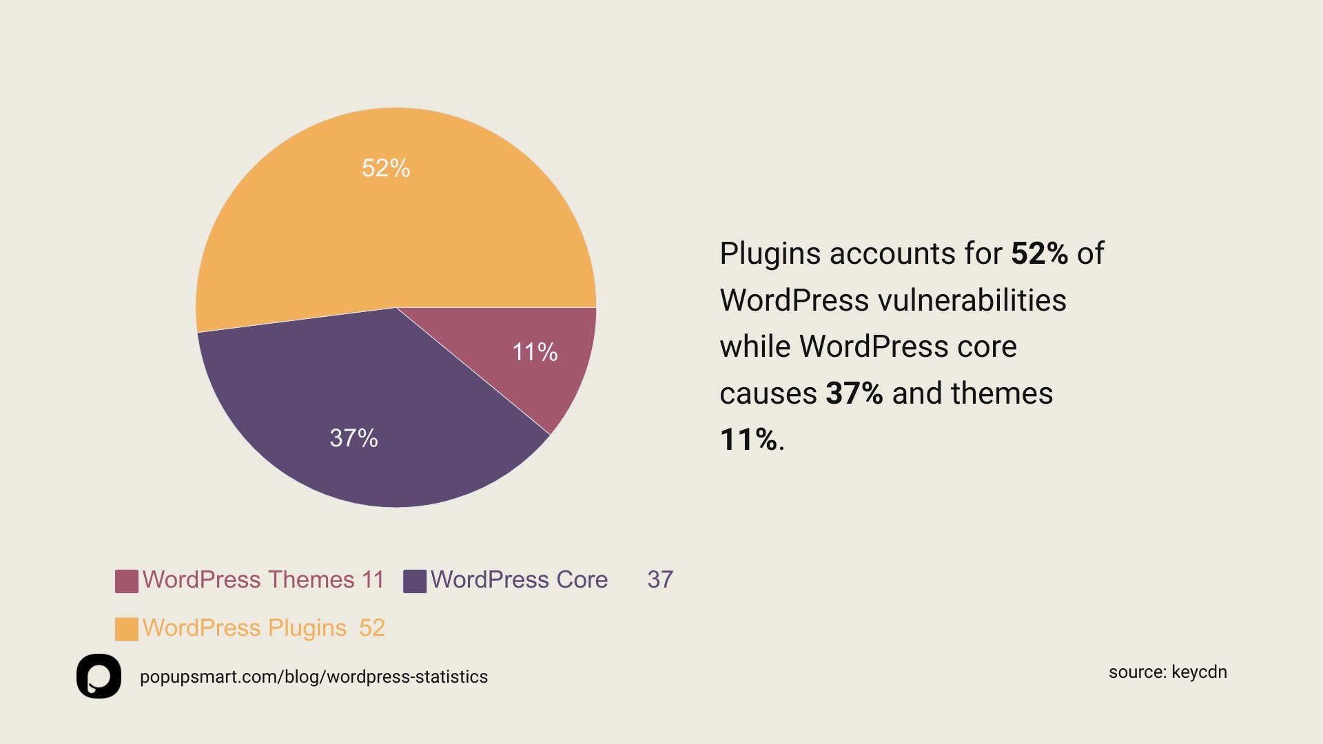- 52% 的报告漏洞是由 WordPress 插件引起的,而 44% 的黑客攻击是由过时的 WordPress 网站引起的。