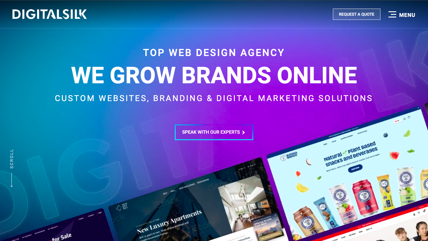 這個數位代理商網站是切入主題的大師級:他們立即傳達其關鍵價值主張,即線上發展品牌。 使用者無需滾動,即可看到投資組合項目的幻燈片,體驗他們可以從 Digital Silk 獲得的作品。 請注意網站導覽列中的「請求報價」按鈕,這是一個在訪客可以看到的 CTA 中加入 CTA 的一個很好的例子。