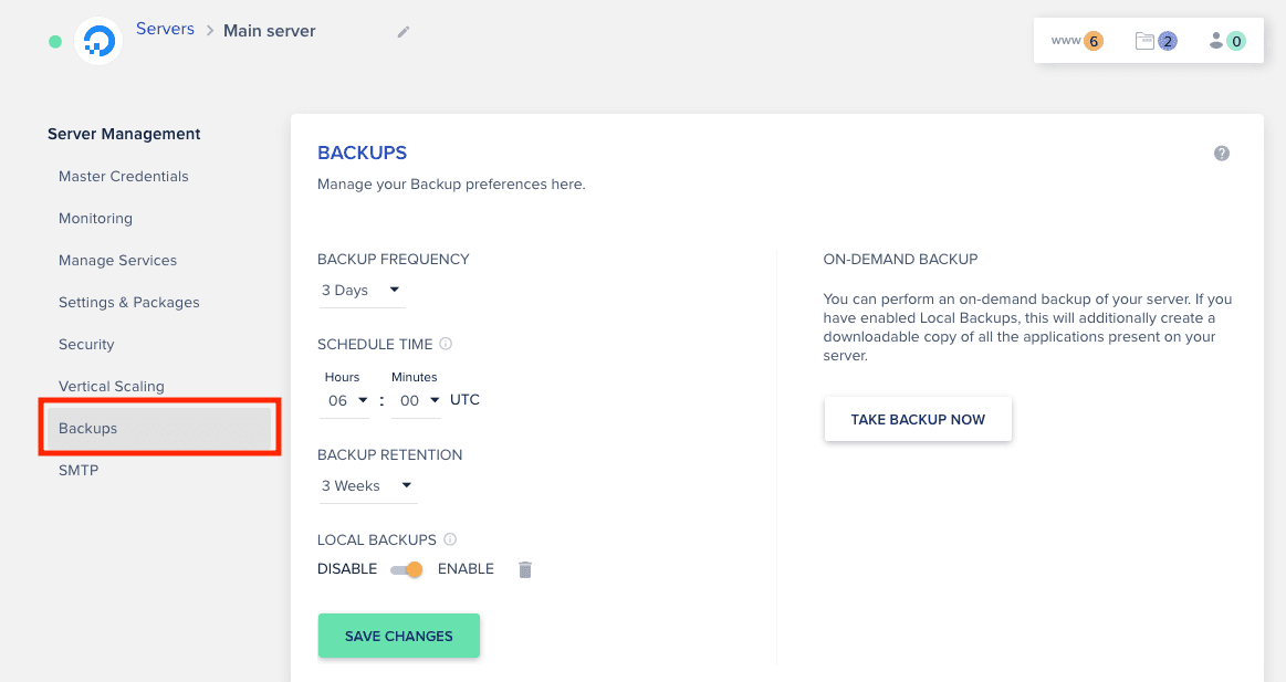 Cloudways 提供服務器備份功能 - 您可以在Server Management > Backups下找到它。 您可以設置備份的頻率以及它們的存儲時間。