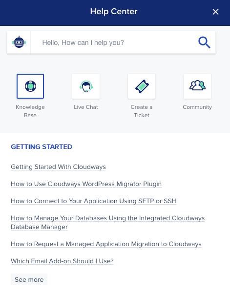 Cloudways 通過聊天為客戶提供 24/7 全天候實時支持。 您還可以創建工單、加入社區聊天或瀏覽知識庫以獲取幫助。