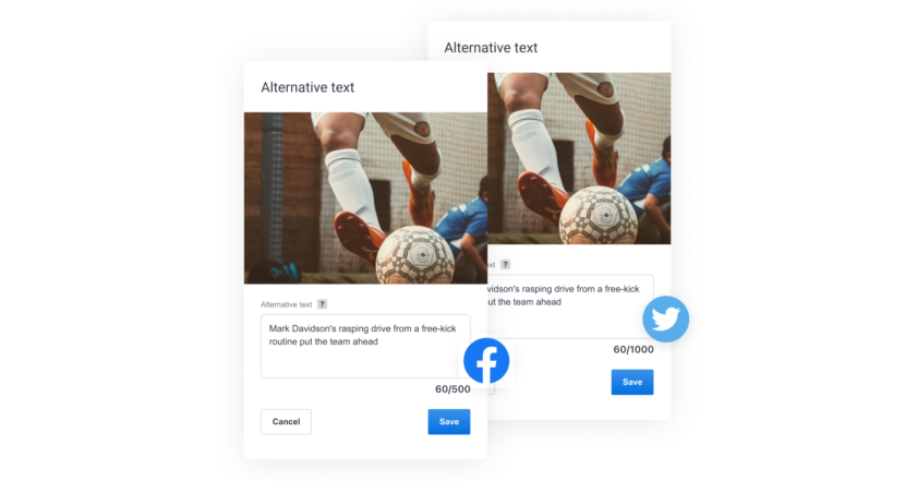 Alt Text 仍然適用於 Facebook、Twitter 和 LinkedIn 上的單張照片帖子以及 Facebook 和 Twitter 上的多張照片帖子。 (注意:LinkedIn API 目前不支持 MultiPhoto 帖子)。