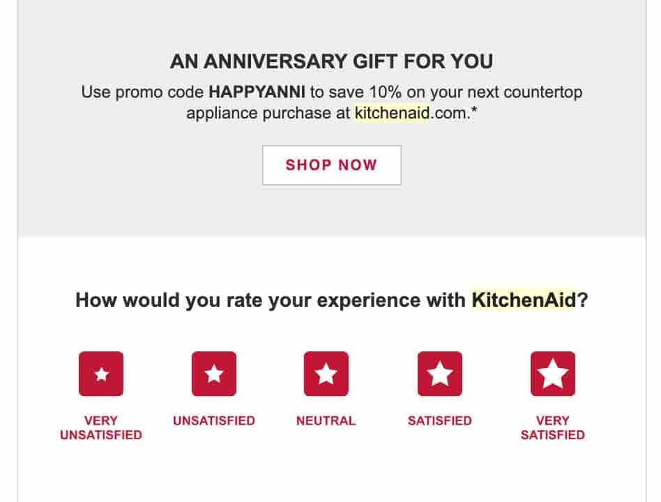 通過他們的審查請求電子郵件,KitchenAid 以一二三的方式打包。 他們慶祝客戶的周年紀念,要求評論,並在下次購買時提供 10% 的折扣: