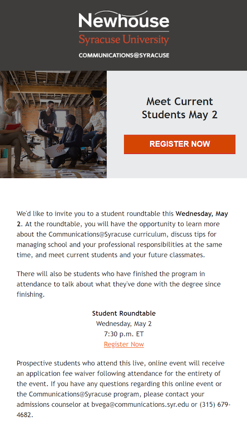 - 他們埋下了線索。 如果您查看最後一個要點,您會讀到“參加此現場在線活動的未來學生將在參加整個活動後獲得申請費減免。” 所以,你是說我所要做的就是註冊,堅持參加整個活動,這樣我就可以節省申請費了? 這聽起來很合理,但是……