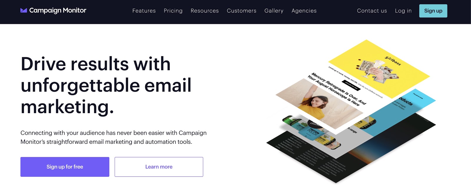 Campaign Monitor 是一項功能強大的電子郵件營銷服務,帶有拖放式電子郵件編輯器,因此創建電子郵件是小菜一碟。 您還可以從其眾多預建模板中進行選擇,以構建適合您公司的個性化電子郵件營銷活動,激勵人們進行轉換,並讓常客對您的網絡內容感興趣。