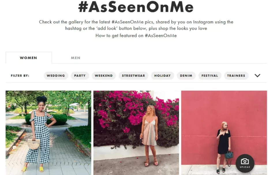時裝零售商 ASOS 在其產品頁面上整合了用戶生成的內容提要。 他們鼓勵顧客使用特定的標籤在社交媒體上分享他們的服裝照片。