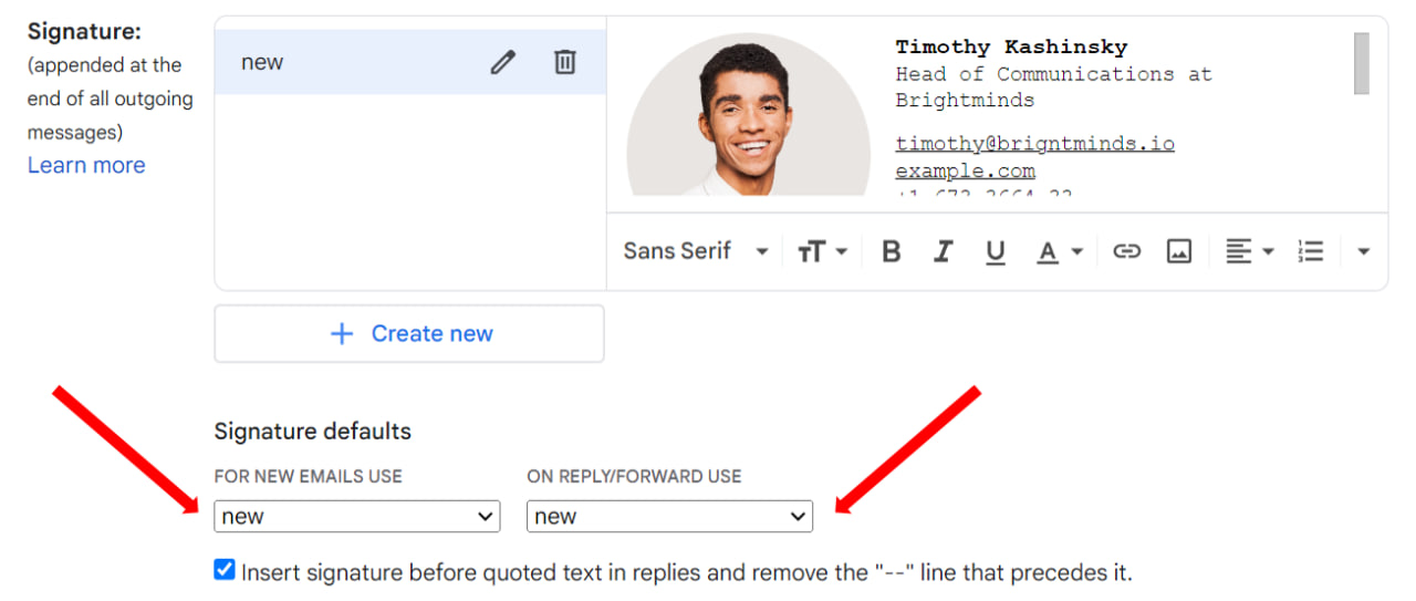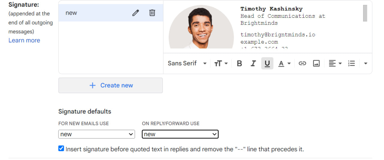 為了顯示您的 Gmail 簽名,您必須啟用它。 為此,您需要建立簽名或將簽名貼到 Gmail 應用程式中。 幸運的是,這個過程很簡單,不需要超過一分鐘,特別是如果您已經使用免費的電子郵件簽名產生器創建了專業的設計。
