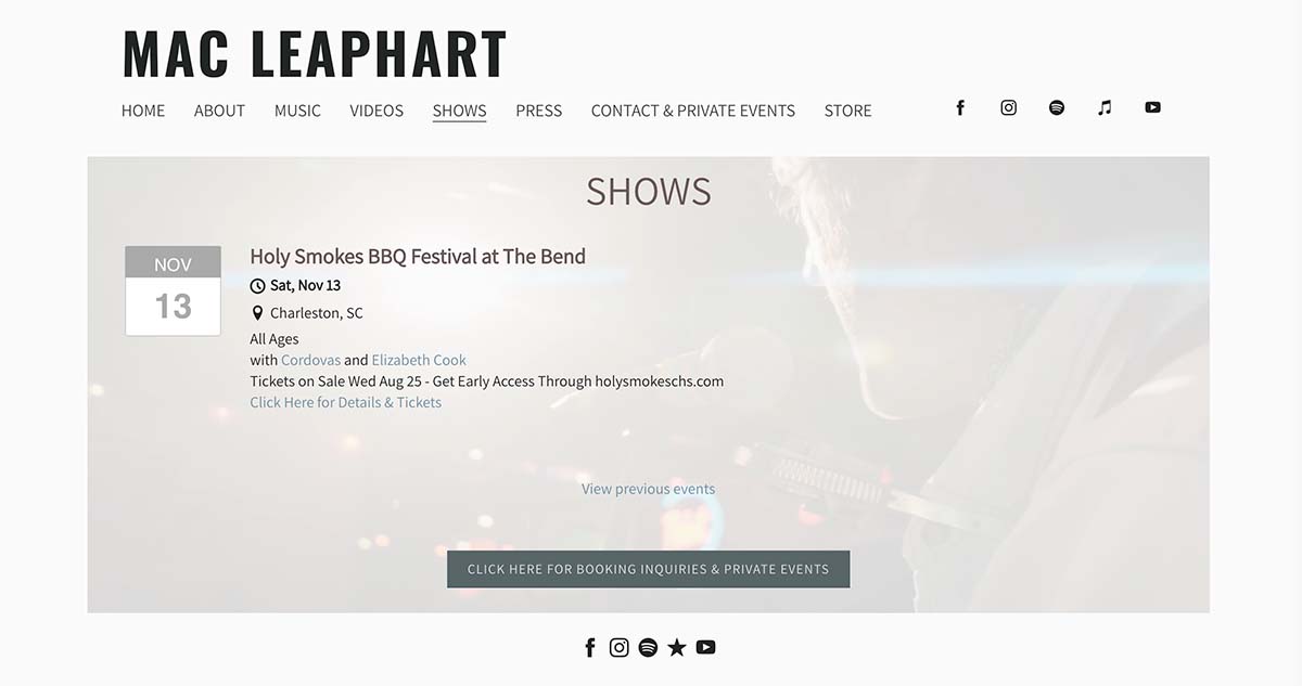 讓粉絲知道您接下來將在哪裡播放您的鄉村音樂。 無論您是在本地演奏、開始全國巡迴演出,還是在家中進行直播,都可以在您的網站上創建一個日曆並直接向您的粉絲出售門票,這樣您就可以預測觀眾人數或加大宣傳力度。