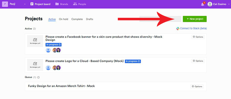 登錄到您的 Penji 儀表板並單擊+New project 按鈕。