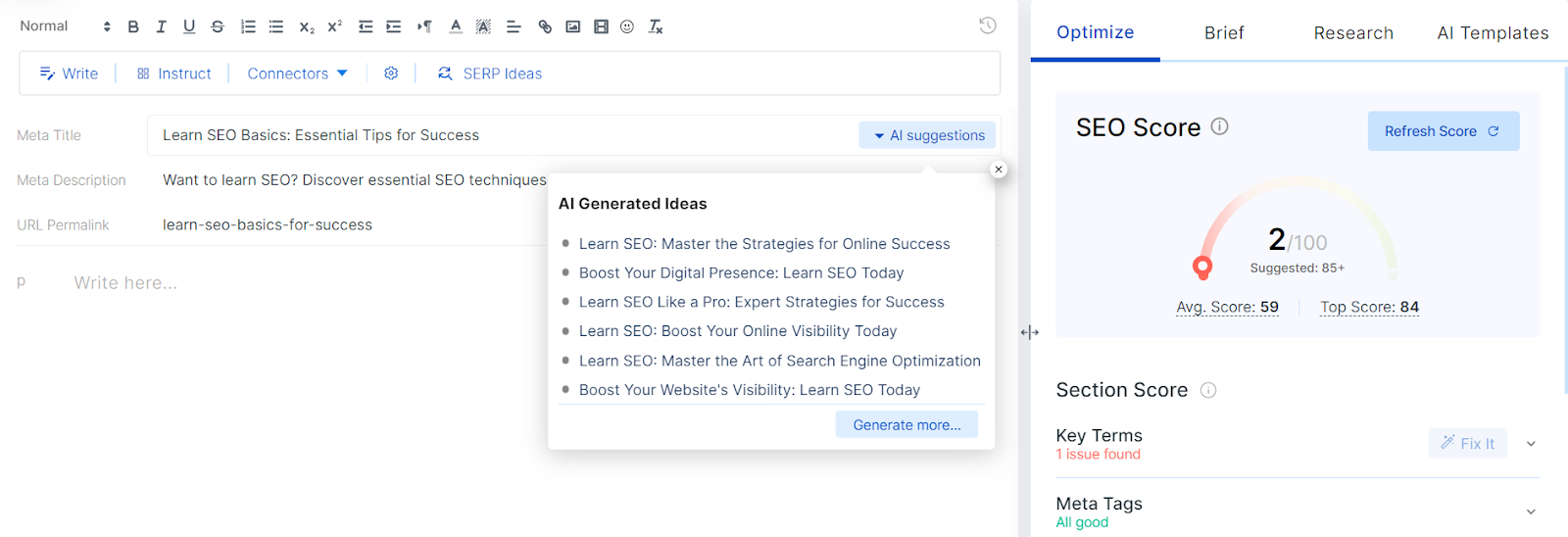 針對目標關鍵詞優化各個網頁。 在頁面標題、元描述、標題、URL 和內容中包含關鍵字。 確保內容有價值、結構良好且易於閱讀。 優化圖像、使用內部鏈接並確保網站適合移動設備。 您可以使用 SEO 審核工具(例如 Scalenut 的內容優化器)來優化您的網站頁面。