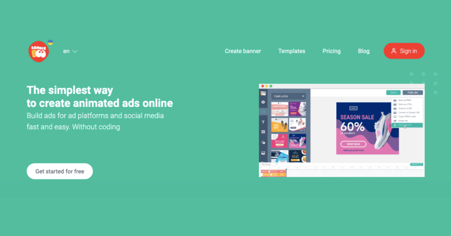 BannerBoo 可以幫助您創建靜態和動畫橫幅。 它提供了大量的尺寸和格式選項。 這意味著您可以選擇創建 GIF 或 HTML5 橫幅。 BannerBoo 是一項非常受歡迎的服務,已與數千家公司合作。 使用他們的模板製作的任何橫幅都將是專業且引人注目的。