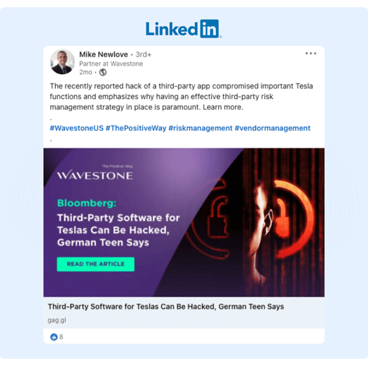Wavestone 旗下公司 WGroup 是一個完美的例子,說明強大的社交媒體戰略如何通過社交銷售增加銷售渠道。 他們有大約 100 名員工,為財富 1000 強公司提供服務,因此在這些公司中與合適的人接觸至關重要。