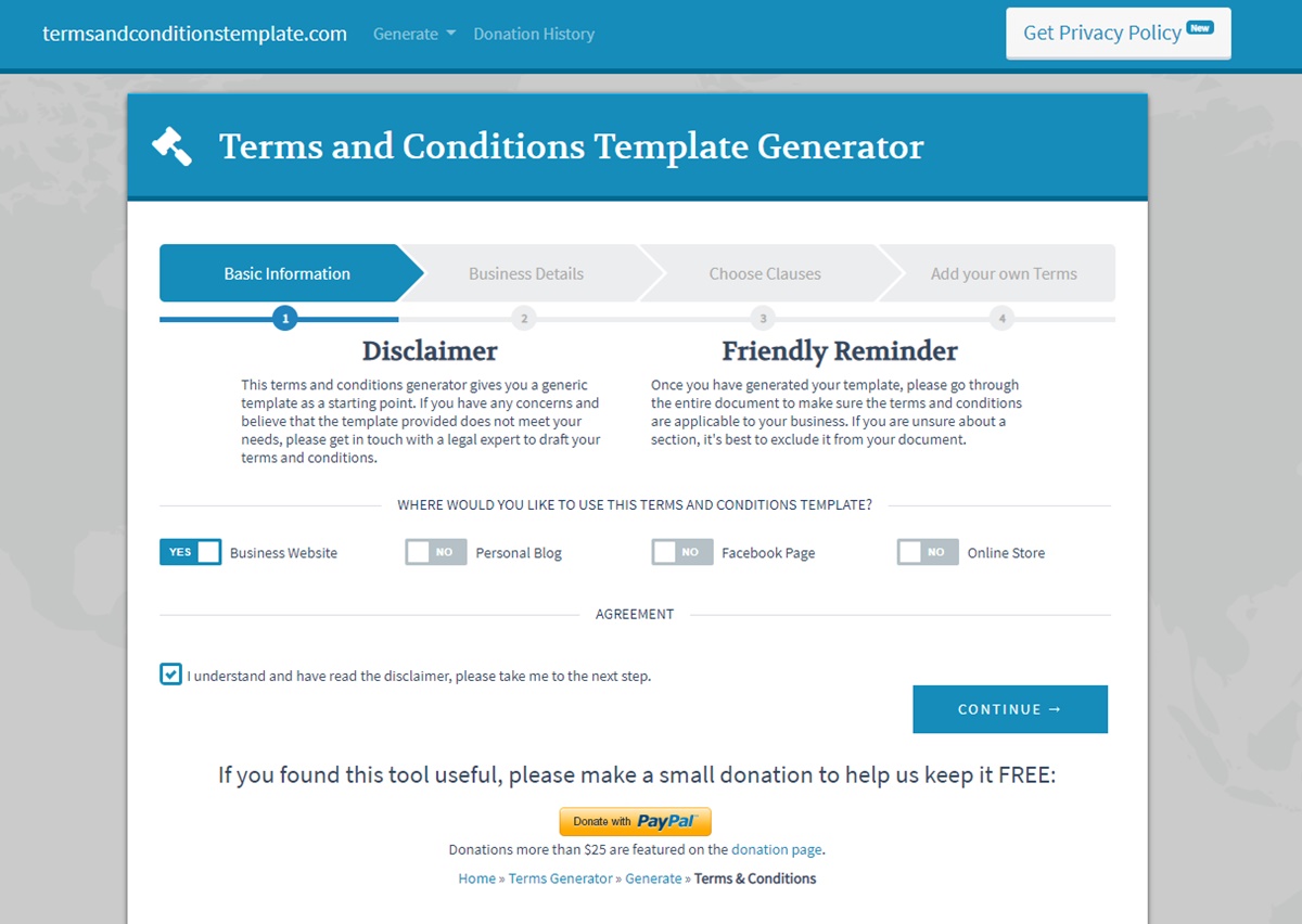 它是最快的術語生成器是有原因的,因為您可以在大約 15 秒內準備好您的文檔。 但最終的結果是相當籠統的,如果在法庭上提出,可能沒有什麼意義。 如果您剛剛開始您的電子商務之旅,這是一個非常好的開始選擇。