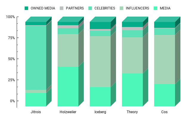 當談到成功的植入時,Theory 與影響者和名人的合作成為最有利可圖的方法。 如前所述,位居榜首的是 Han Hyo-joo 的 Instagram 帖子,該帖子產生了令人印象深刻的 36.2 萬美元 MIV。 值得注意的是,前列的人物絕大多數都是各種有影響力的人物,只有少數著名的媒體聲音出現,例如《名利場》、《Vogue》韓國版和《Vogue》美國版。