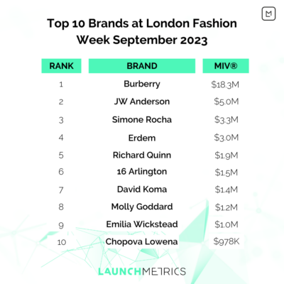 以下的輪播圖展示了紐約、倫敦、米蘭和巴黎時裝週前 10 名品牌的排名。 每個品牌的總 MIV 是一項評估,涵蓋不同管道的展示位置。 這包括與特定搜尋查詢相關的社交媒體和線上展示位置,以及標籤和評論等互動。 這些數據概述了某些品牌如何與行業競爭對手競爭。 這使品牌能夠發現成長機會並提高其整體影響力。