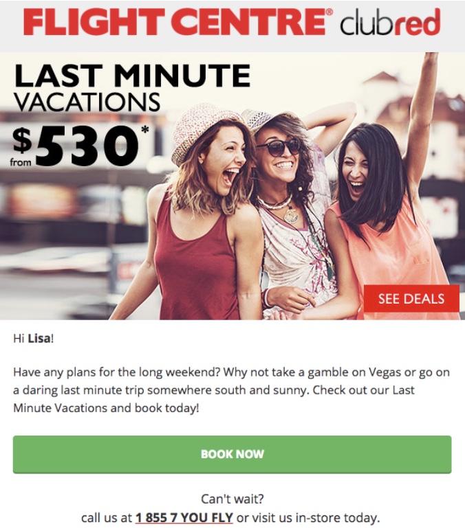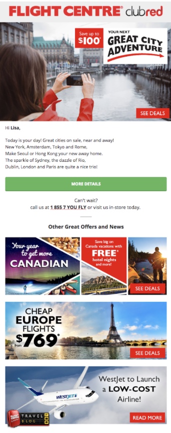 Flight Center 在吸引訂閱者方面做得非常出色,這些電子報式的電子郵件以實惠的價格突出了夢幻般的目的地(附有引人入勝的照片)。 這些電子郵件成功的秘訣在於,Flight Center 將其消費者數據與動態內容相結合,以展示吸引口味、先前購買和在線衝浪活動的便宜貨。