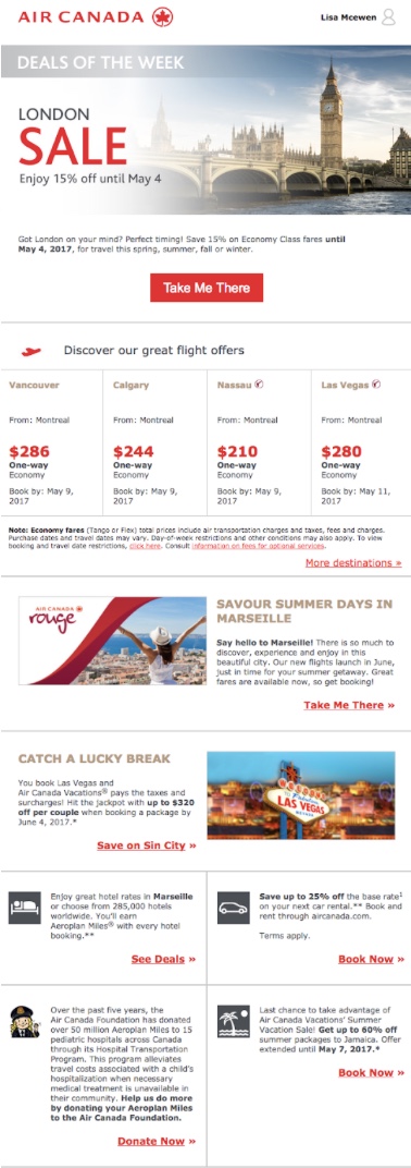 在他們的電子郵件註冊過程中,加航鼓勵新訂戶提供他們的家鄉機場以及他們有興趣參觀的地方。 使用這些信息,公司會根據訂閱者的喜好發送促銷信息。 航班套餐從訂戶的家鄉機場(在本例中為蒙特利爾)出發,前往訂戶選擇的目的地。