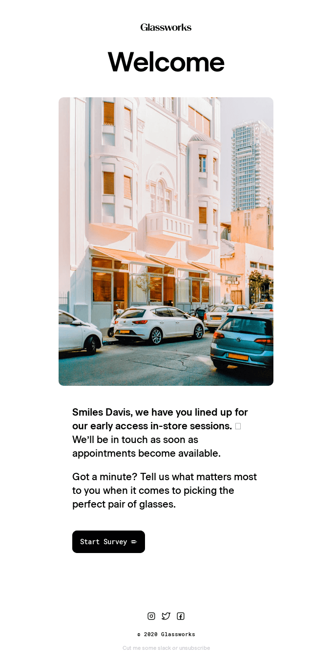 為什麼這個歡迎電子郵件示例有效:這是來自 Glassworks 的一封很棒的歡迎電子郵件。 主題行中的表情符號立即在擁擠的收件箱中脫穎而出,並鼓勵收件人打開它。