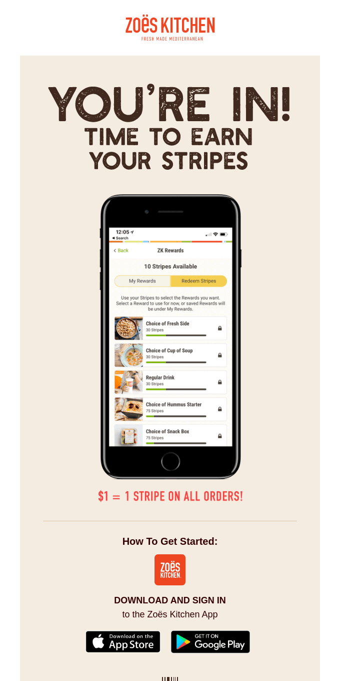 為什麼這個歡迎電子郵件示例有效:這個超清晰和簡約的歡迎電子郵件顯示而不是告訴收件人下一步。 Zoe's Kitchen 沒有使用分步指南或要點,而是通過高質量的圖形和消息末尾清晰的 CTA 按鈕向人們展示瞭如何贏得條紋。